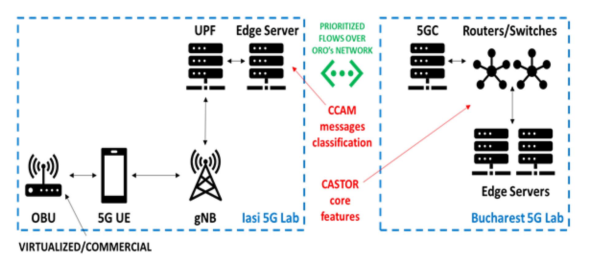 A virtualized On-Board Unit (OBU) will be developed to simulate the generation of Cooperative Awareness Messages (CAM) and Decentralized Environmental Notification Messages (DENM), with DENMs given higher priority due to their critical nature. The messages generated by virtualized OBU will be transmitted via a real 5G network in which the CASTOR’s solution will reside.